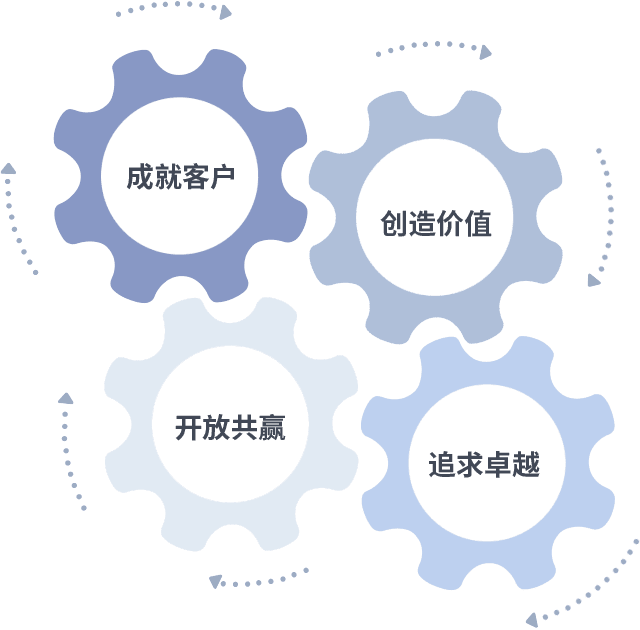 成就客户是一切决策的出发点,,,创造价值是衡量所有工作的标准,,,追求卓越是我们做事做人的态度,,,,开放共赢是我们的格局也是最终的结果。。价值观的齿轮环环相扣,,,推动着组织里的每个人不断向前。。。。