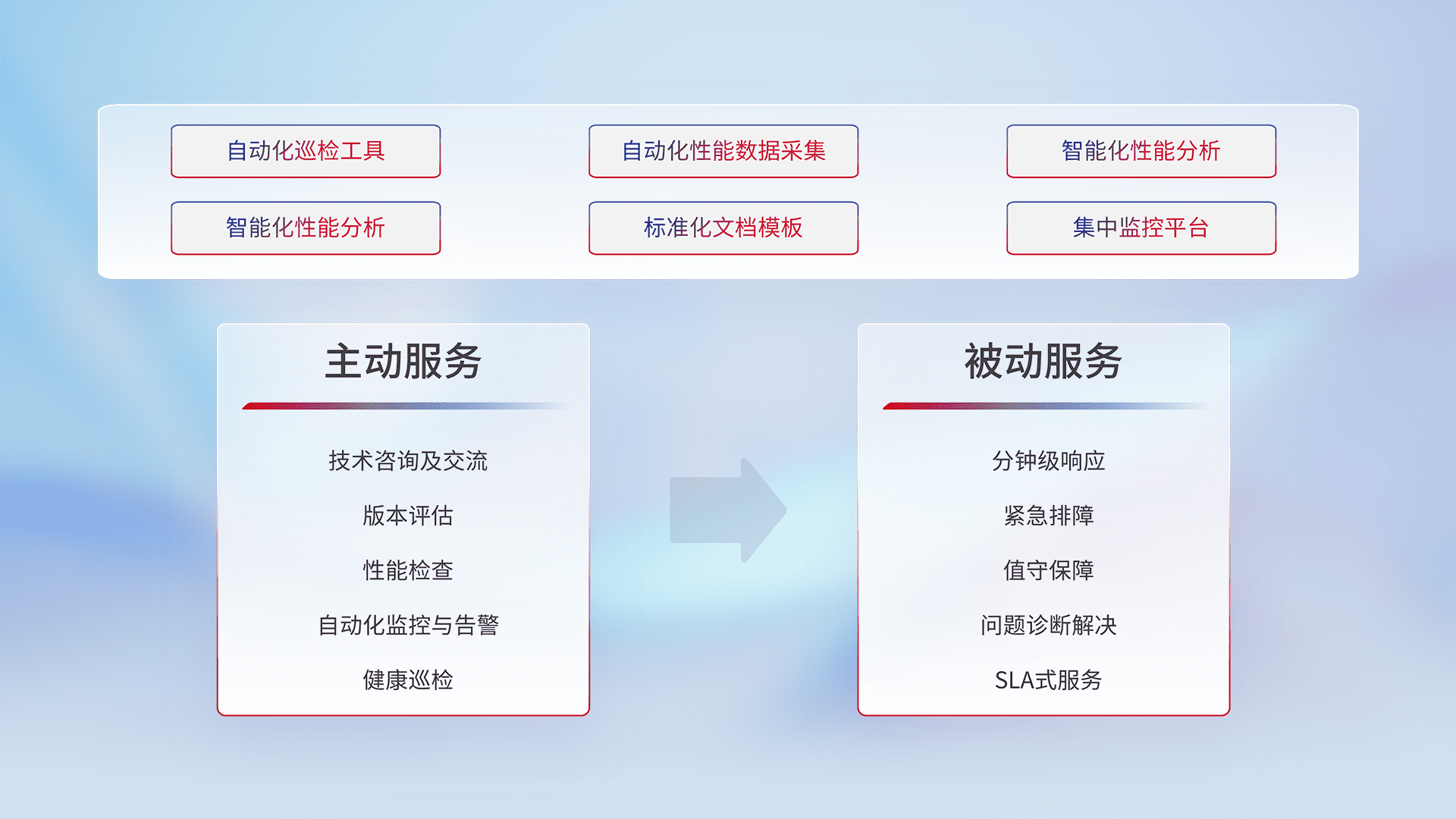 智能化工具和标准化文档,,保障服务质量,,提供主动服务(包含技术咨询、、、、版本评估、、性能检查、、、、自动化监控与告警、、健康巡检)和被动服务包含(分钟级响应、、、紧急排障、、、、值守保障、、问题诊断解决、、SLA服务)。。
